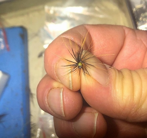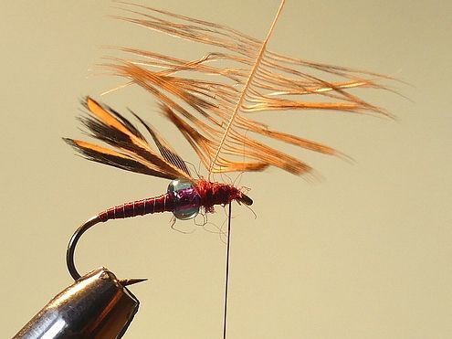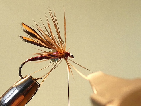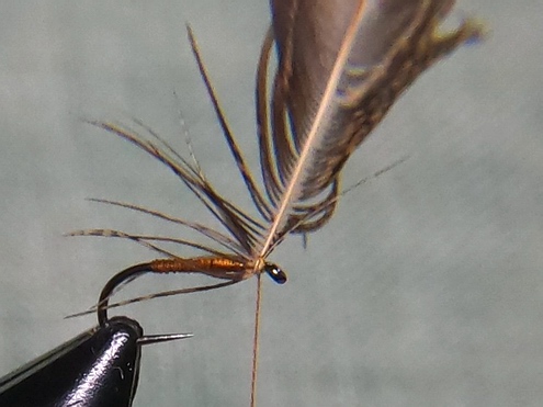 Feder abbinden, mit einen Kopfknoten sichern, etwas Bindelack zur Sicherung auftragen. | Oben: Fertige Fliege. Viel Spass beim Nachbinden. Gruß Bernd |