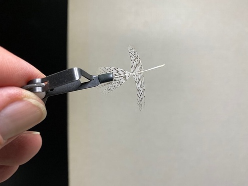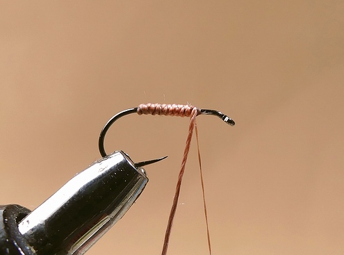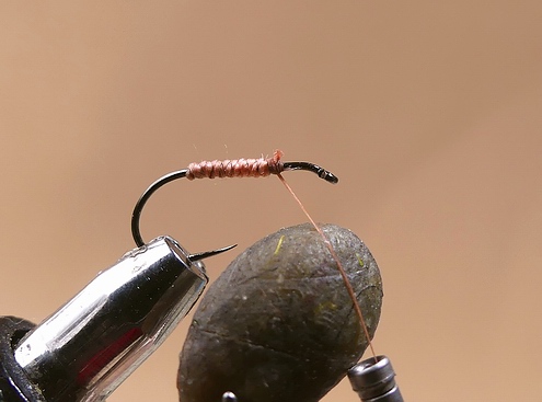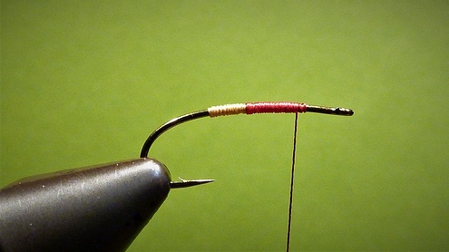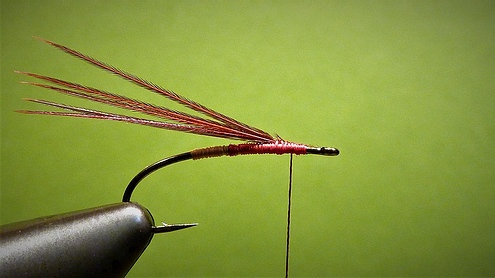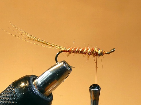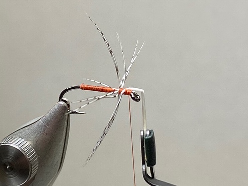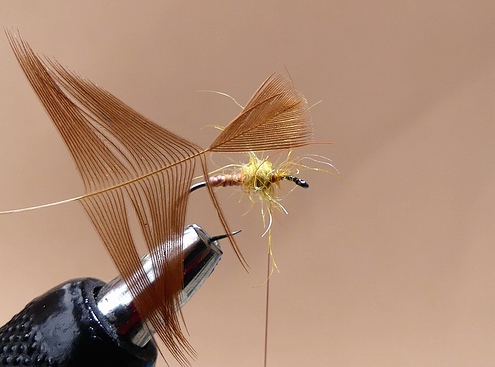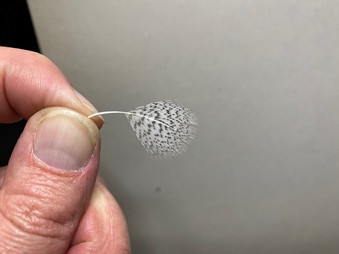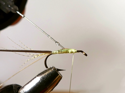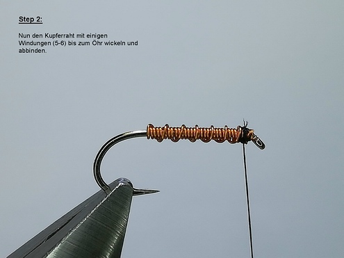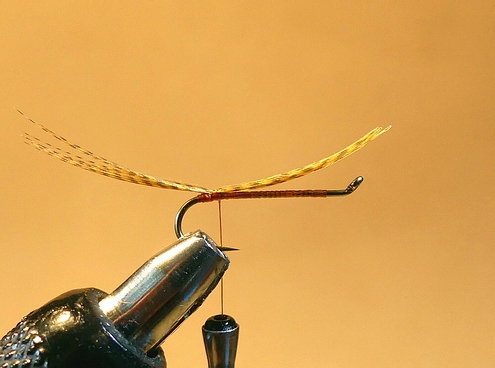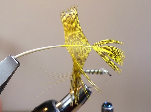 | Anschließend binden wir ein Stück Pfauengras über das Hakenöhr stehend ein, um es vorsichtig mit ein paar Windungen ab der Hechel beginnend als Köpfchen einzuarbeiten. | ![]() |