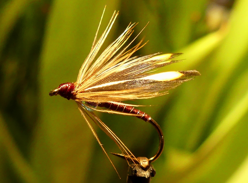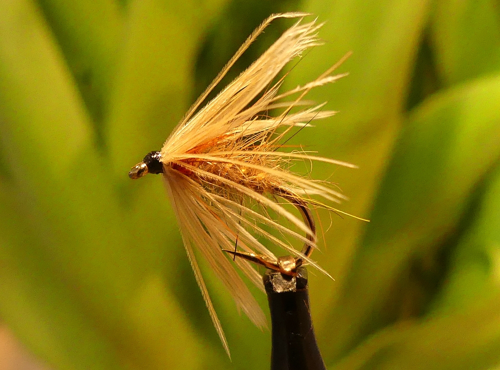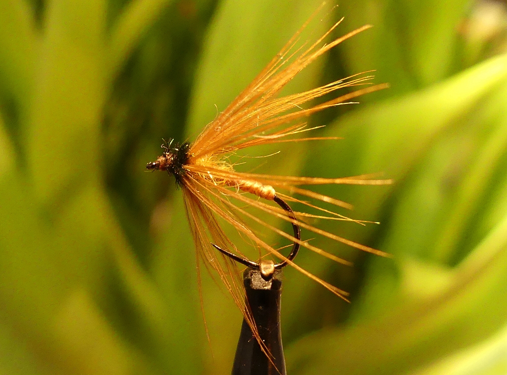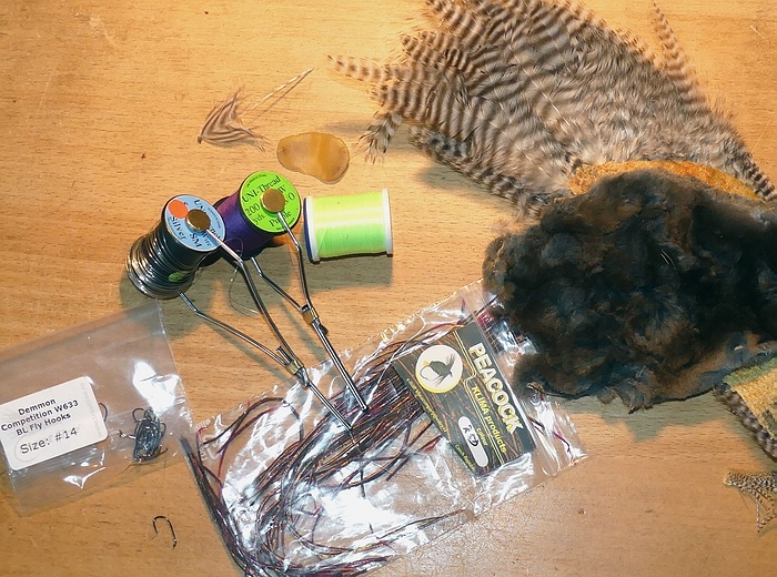 Haken: TMC 100BL #14 Thread: Gossamer Silk, Highland Green Abdomen: Gossamer Silk Thorax: Peacock herl Hackle: Whiting hen cape Bindeanleitung: |
