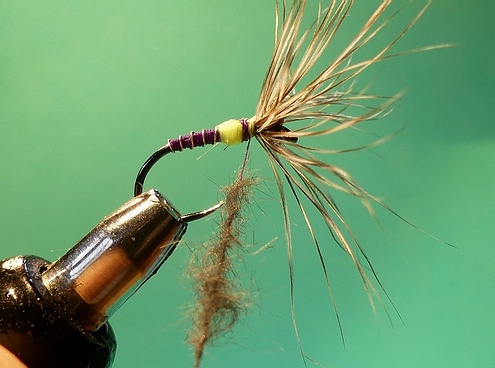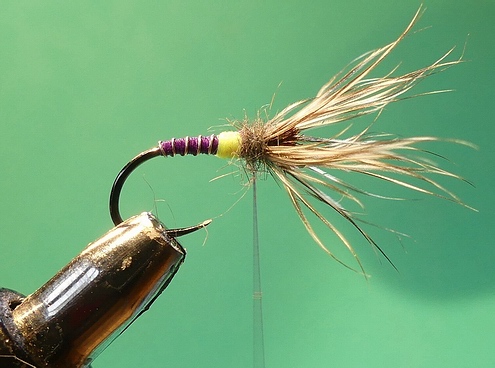Haken: Demmon Competition W633 BL #14 Bindefaden: Uni Thread 8/0 purple Kopf: Pfaugras (rot gefärbt) Hechel: indischer Hahn Sattel grizzly *) Hinterleib: Bindefaden Rippung: Uni French Silberdraht XS Hotspot: Ultra Thread 280 Fluo Chartreuse Thorax: Maulwurf im Touch-Dubbing Sonstiges: Bienenwachs (Sigi) *) Ich habe z.Zt. leider keine Grizzly-Hechel von