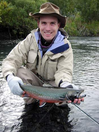 Es zeigt einen kleinen Silberlachs, sowie drei unterschiedlich große und unterschiedlich gezeichnete Dolly Varden. Foto und Copyright (2002): Stefan Plüquett