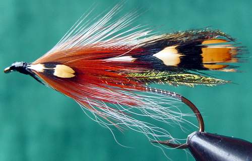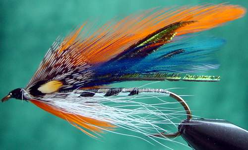 Haken: Mustad 79580, Größe 2-4 Bindegarn: Danville 6/0, schwarz Tag: flaches Silbertinsel Körper: orangefarbenes Floss Rippung: flaches Silbertinsel Unterschwinge: 5 Pfauengrasfibern, darüber ein wenig (nicht zuviel !!) weißes Bucktail als Abschluss eine goldene Schopffeder vom Goldfasan Oberschwinge: 4 mittelgraue Sattel- oder Hahnenhecheln Wangen: Körperfeder vom Silberfasan, darüber Jungle Cock |