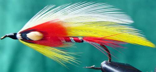 Haken: Mustad 79580, Größe 2-4 Bindegarn: Danville 6/0, rot Schwanz: rote Hechelfibern Körper: flaches Silbertinsel Unterschwinge: ein Büschel dunkelbraune Sattelhechelfiebern Oberschwinge: 2 gelbe Sattelhecheln, darüber einen „Tick“ kürzer, 2 weiße Sattelhecheln Wangen: Krickente, darüber Jungle Cock |
