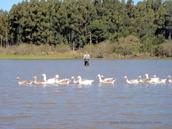 "Flachwasserzone" ist im Falle dieses Sees ein relativer Begriff, im glücklichen Fall endet das Ufer auf Höhe der „Juncos„ - einer schilfgleichen Pflanze, ohne weiter störende Hänger, Hindernisse, oder, um die Sache sportlicher zu gestalten, das Litorale geht über in den undurch- dringlichen grünen Dschungel, mit all seinen erdenklichen hölzernen Unrat gespickten Bereich. Dann wird das Präsentieren der Mücke zum äußersten Geduldspiel, auch wenn mit „antienganche“, dem mit obligatorischen Krautschutz versehenen Haken - Hänger sind unvermeidbar. Und denkt erst gar nicht daran, einen dieser Hänger durch auch noch so vorsichtiges Anpirschen mit der Hand zu lösen... WUFFF...... das war ein kapitaler, torpedogleich |