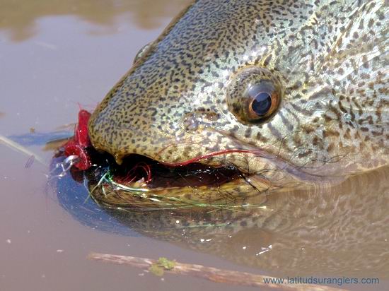 Ich wählte das kürzlich bei einer Flasche Rotem entstandene Fliegendesign: schwarzer, nicht zu langer Bucktail-Schwanz, hell glänzender Dubbingkörper und einen nicht allzu üppigen Muddlerkopf in grün, natürlich mit Krautschutz und alles gebunden auf einem 2/0 er Haken. Über eine kleine Kiesbank schlich ich mich ins etwa Hüfttiefe Wasser und begann zu casten. Ich fischte diesen Bereich von der Außenkante der Vegetation zum Uferbereich hin ab. Und schon nach dem etwa zehnten Cast hatte ein halbwüchsiger Tararira in gewohnter Manier die Fliege genommen, kurzer Photoshot und adios. Immer wieder landete das nun erprobte Design mit einem vernehmlichen Plopp inmitten des Grüns oder auf freier Wasser- fläche. Eine kleine Pause vor dem einstrippen, dann aus dem Handgelenk mit wirklich kurzen Zügen über eine Strecke von einem Meter die Fliege eingeholt, zwei false casts und weiter... |