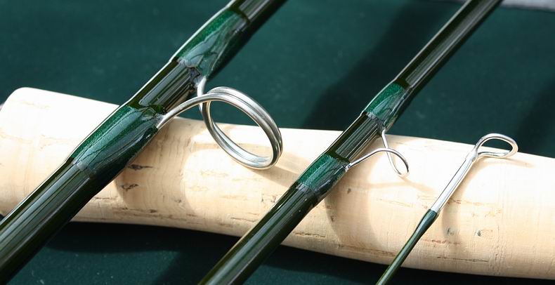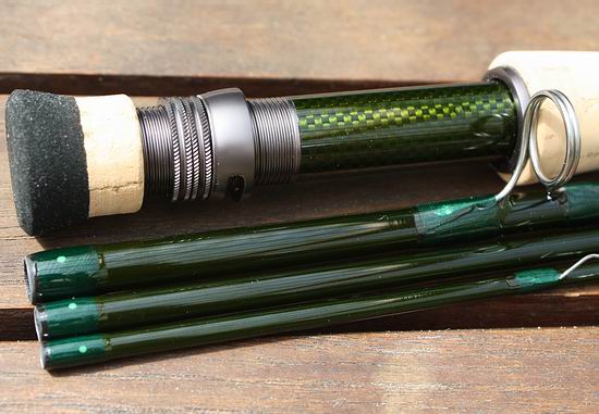 Teilung und Maße: Vierteilige Fliegenrute, Länge 9'0" (zusammengesteckt und nachgemessen 274 cm), vier nahezu gleichlange Teile um 72 cm. Angegebene Schnurklasse: #7. Das Gewicht der Rute beträgt leichte 89 Gramm. Blank-Durchmesser über dem Griff: 9,6 mm, Blank-Durchmesser an der Rutenspitze: 1,8 mm. Ausstattung: Geschliffener, dunkelgrüner, leichter und schlanker, glanzlackierter Ruten-Blank aus hochmodulierter Kohlefaser. Die Verbindungen der einzelnen Rutenteile sind als passgenaue Überschubverbindungen mit farblich zur Rute passenden Punktmarkierungen ausgeführt, sie greifen von unten nach oben 5,0; 4,3 und 4,5 cm ineinander. Die Oberseiten der einzelnen Teile wurden gegen eindringenden Schmutz, Nässe etc. abgedichtet. Beringung: Handteil ohne Beringung und ohne Fliegeneinhängeöse, Teil 2 mit zwei abgestuften, geschlossenen Doppel-Schlangenringen (REC Schock absorbierende Leitringe ohne Einlage) und einem Schlangenring, Teil 3 mit drei abgestuften Schlangenringen, Spitzenteil mit vier abgestuften Schlangenringen und dem Spitzenring. Die Beringung wurde mehrfach abgestuft, die Ringdurchmesser und Drahtstärken fallen zur Schnurklasse passend aus, alle Ringe sind superhart verchromt. Ring- und Zierbindungen halbtransparent in Dunkelgrün. Alle Bindungen wurden gründlich (reichlich) lackiert und versiegelt. |