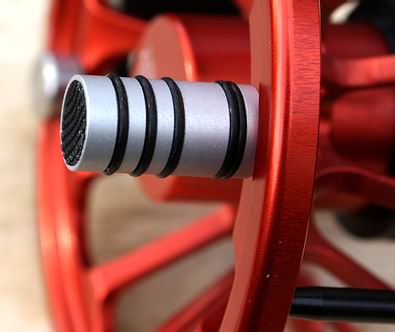 | Die Tryst besitzt ein starkes und fein einstellbares Scheibenbremssystem, welches als geschlossenes System im Rollenrahmen untergebracht wurde. Mit Hilfe des gut bedienbaren Bremseinstellrades aus Aluminium (Durchmesser 24,5 mm) auf der Gehäuserückseite lässt sich die kräftige Bremse in nur 1 1/4 Umdrehungen (25 Klicks) rasch von "frei" bis "sehr kräftig" regulieren. Unser Bremsen-Testwert (maximales Abzugsgewicht in Kilogramm bei vollständig geschlossener Bremse und bei gefüllter Spule) ergibt einen Wert bis rd. 2,6 Kilogramm. Damit ist die Bremse als "stark" zu bezeichnen und bietet einen für diese Rollenart- und Schnurklasse in der Praxis weit mehr als ausreichenden Wert. Ein absolut ruckfreies, sanftes Anlaufen der Spule ist jederzeit gewährleistet. Im Betrieb lässt die Rolle in beiden Laufrichtungen ein leises Schnurren hören. Der Spulenwechsel ist einfach (analog DC Serie): die Spule wird einfach von hinten nach vorne aus dem Gehäuse gedrückt und beim Wiedereinsetzen ebenso einfach wieder eingerastet, eine Gummiring-Arretierung macht's möglich. Im Praxisbetrieb zeigte unser sehr präzise gefestigtes Testmodell einen äußerst korrekten und sehr gut ausgewuchteten und völlig schlagfreien Rundlauf, auch bei höheren Abzugsdrehzahlen, ohne jegliche störende Toleranzen. Jedes technische Detail an der Tryst funktioniert leichtgängig und zuverlässig. |