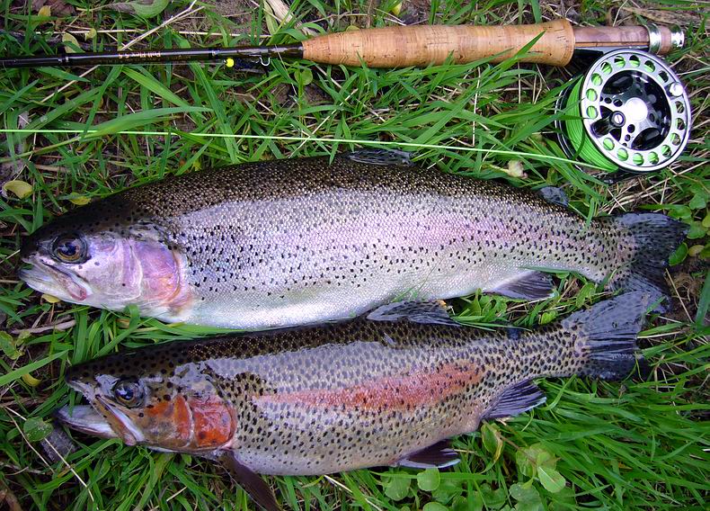 Tolles Duo... Während sich die obere Forelle u.a. durch fehlende Brustflossen als Besatzfisch von zweifelhaften Wert für's Gewässer outet, ist der untere, rassige Fisch mit seinem Temperament und den tollen Farben immer gerne gesehen... und gefangen... | Foto & Copyright: Michael Müller |