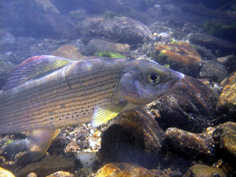 Eine ca. 30cm große Äsche aus dem Weißen Regen. Sie hat sich nach dem Drill direkt vor meinen Füssen zum „Erholen“ hingestellt und war nach paar Minuten immer noch da. Da habe ich meine Pentax Optio WP 'mal als Unterwasserkamera getestet und munter drauflosgeknippst (ist also keine Aquariumaufnahme oder sonst wie getrickst...). Foto & Copyright: Hans-Dieter Wagner |