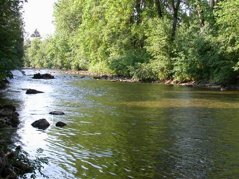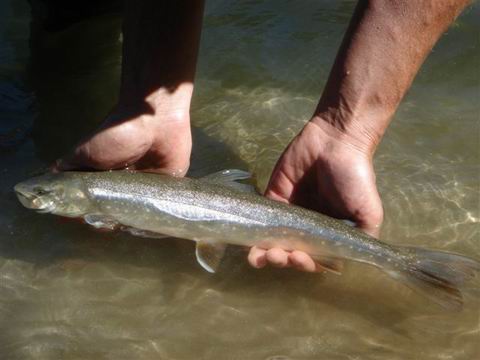 Äschen bis zu einer Länge von 45 cm und Saiblinge bis 43 cm gingen mir auch in allen fünf Abschnitten vor allem auf die Trockenfliege. Diese beiden Edelfische sind aber bei weitem nicht in der selben Anzahl wie die Forellen anzutreffen. Der Leitfisch ist die Bachforelle. Die durchschnittliche Grösse der von mir gefangenen Fische lag bestimmt bei 35 bis 40 cm. Es ist schon fast schade, an diesem Gewässer nicht eine „Trockene“ auszulegen. Bei einer eher geringen Wassertiefe von ca. 50 bis 80 cm bei normalem Wasserstand, kann auch in der Hitching-Technik (gewolltes Dreggen flussabwärts) jede Fisch-Art zum Biss provoziert werden. Natürlich bleibt bei der Verwendung der gängigen Nymphen aber auch Streamern der Erfolg nicht aus. |