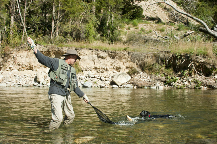 Fliegenfischen in Neuseeland (2/3): Labrador LoLa! scheucht die Fische ins Netz … , Baton River, Nelson-Marlborough, NZ | Foto & Copyright: Gebhard Krewitt