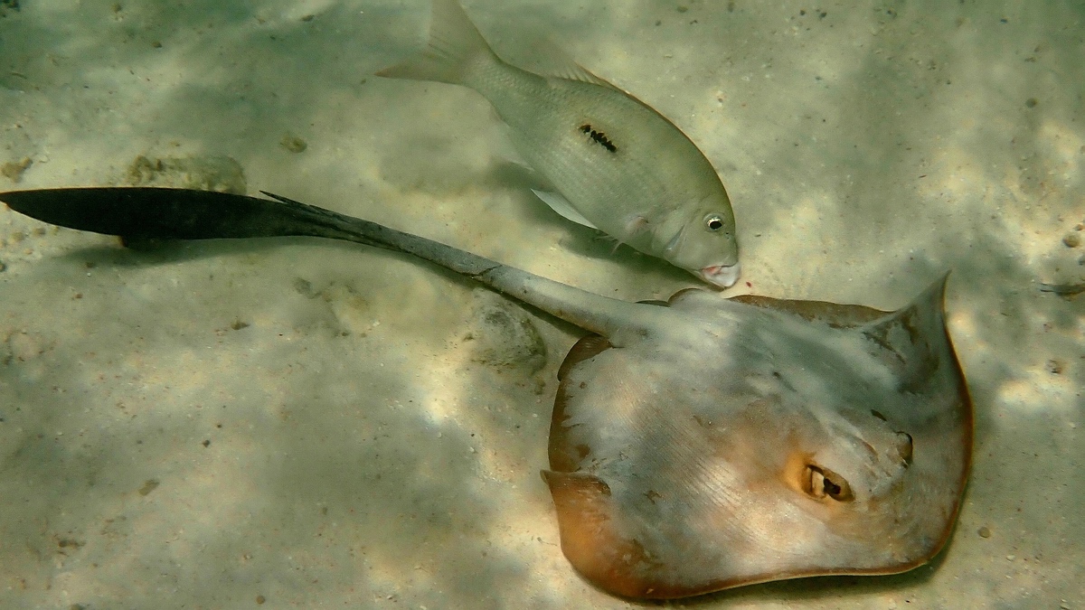 (B-20) | "Seychellen Light Tackle Flyfishing: "Arbeitsgemeinschaft": ein Federschwanz Stechrochen und sein Freund, ein Thumbprint Emperor. Beide übrigens häufig auf den hiesigen Flats anzutreffen. Erstere oft im flachen Wasser im Sand eingegraben, so dass man beim Waten aufpassen sollte!" | (Zum Bericht: Seychellen Light | März 2023) | Foto & Copyright: Michael Müller |