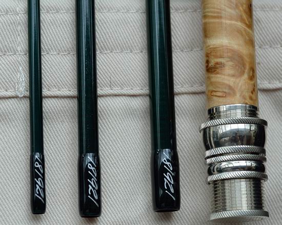 | Die oberen Enden der Steckteile sind gegen Schmutz und Wasser abgedichtet. Die Verbindungen dieser Steckteile sind als exakt passende Überschubverbindungen ausgeführt. An den Überschüben wurde bei jedem Teil die Seriennummer einlackiert und am Handteil gibt es rotfarbene Zierbindungen, die handgeschriebene Rutenbezeichnung und das silberne Winston Logo. | ![]() |