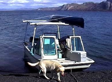 | Nach dem Essen sind wir zu neuen Taten bereit. Rob bietet uns ein Hechtfischen an einer seiner Top-Stellen an. Mir aber steht nach dem doch etwas groben Trolling-Fischen der Sinn jetzt eher nach leichter Fliegenfischerei mit der geliebten 5er Rute, zumal unser Guide alternativ dazu von einem wahren Traumplatz für Äschen am Yukon River schwärmt. Allerdings müssen wir dazu zuerst die restlichen etwa 20 Meilen des Lake Laberge hinter uns bringen, um dann in den dort nach Norden hin auslaufenden Fluss zu gelangen. Erwartungsvoll packen wir zusammen und brechen zur langen Fahrt in Längsrichtung des Sees auf. Insgesamt legen wir an diesem Tag – die Rückfahrt mit eingerechnet – gute 60 Meilen, also rund 100 Kilometer, mit dem Boot zurück. Wieder ziehen an den Ufern phantastische Landschaftsbilder in schnellem Tempo an uns vorüber. Große Schutzscheiben, über die gesamte Bootsfront verteilt, wehren dabei Wind und Spritzwasser ab, so dass die rasante Fahrt relativ gemütlich verläuft, sieht man einmal von gelegentlich harten Schlägen und Stößen gegen die Wasseroberfläche ab. |