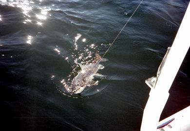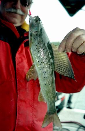 Nach etwa viertelstündiger Fahrt drosselt Rob in der Nähe einer felsigen Uferlandschaft den Motor, um die Trolling-Ruten auszusetzen und nahezu handlange, silberne Blinker auf eine Tiefe von etwa 20 m hinabzulassen, dorthin, wo das Echolot Fische optisch und akustisch anzeigt. |
