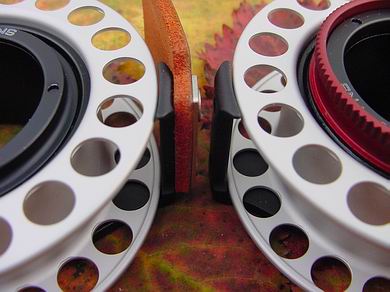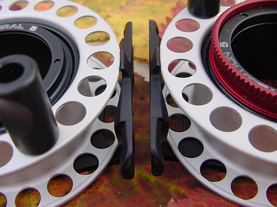 | Gehalten wird die Spule durch einen Gummiring auf dem inneren Gehäuseteil und eine entsprechende Aussparung an der Spuleninnenseite (auf den Fotos rechts und unten gut zu erkennen). Ein Umbau von Links- auf Rechtshandbetrieb und umgekehrt ist möglich. Bei der Revo bitte am besten vom Hersteller instruieren lassen, bei der Nat wird einfach das Bremsleder umgedreht und wieder angeschraubt. Im Betrieb arbeitet die Revo beim Schnurabzug geräuschlos, beim Einkurbeln lässt sie ein dezentes Klickern hören. Die Nat schnurrt leise in beiden Laufrichtungen. Der Rundlauf beider Rollen ist absolut abweichungsfrei, sauber und perfekt ausbalanciert. | ![]() |