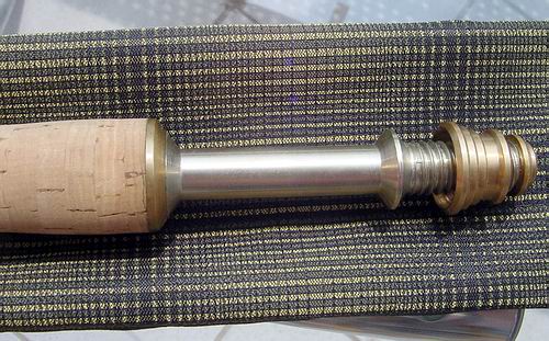 | Die Oberfläche des Blanks weist keinerlei Unregel- mäßigkeiten auf und die Lackierung ist sehr ordentlich, ebenso die Ring- und Zierbindungen. Besonders schön ist auch der Griff geworden, der mit seiner 19 cm langen Handauflagefläche aus erstklassigen Kork (5-mm-Scheiben) und dem schweren Massiv-Metall-Rollenhalter besonderes Augenmerk verdient. Totz seinem etwas ungewöhnlich anmutenden Design fünkioniert der griffwärts zu Schraubende Rollenhalter bestens. Der Rollenfuß liegt an zwei Punkten fest auf, die schwere Messingmutter fixiert diesen schließlich sicher. |