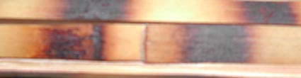 Gehobelt werden also die beiden, vom Spalten her rührenden Seitenflächen des Bambusstreifens. Zu diesem Zweck legen wir ihn mit der Aussenhaut gegen eine Kerbenfläche. |