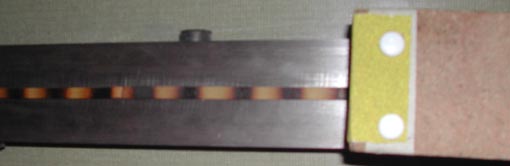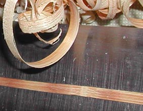 Sie fragen nun zu Recht: Was ist es? Das ist eben individuell, für den einen ist es diese Rutenaktion, für einen anderen passt sie überhaupt nicht, dafür etwas ganz anderes! Mit der Zeit kommt man als Rutenbauer aber soweit, dass man einem Fliegenfischer nur ein wenig zuschauen muss, um genau zu wissen, welche Rute in seiner Hand liegen müsste. Für mich als Rutenbaufetischisten ist dies der allergrösste Reizpunkt. Hier ist der Grund, weshalb ich die Ruten nicht nur für mich alleine bauen möchte. Ich könnte ja nur noch einen gewissen Typus Rute bauen, eben denjenigen, welcher auf mich persönlich abgestimmt ist. Da ist jeder Kunde mit seinen Wünschen eine herrliche Herausforderung um gemeinsam heraus zu finden, welche Rute er in Händen halten sollte. Die gegenseitige Begeisterung, wenn das fertige Resultat vorliegt und voll ins Schwarze getroffen hat, ist dann der grösste Lohn. Für meine 13-fach Gesplissten benötige ich sehr feine Spleisse. Dank diesen sehr feinen Spleissen, gelingt es mir, noch mehr Kraftfibern in den Blank zu kriegen, als mit der herkömmlichen 6-Spleiss Variante. Diese feinen Spleisse können nur auf der Spitzenseite der Hobelform gefertigt werden. Deshalb stelle ich das Endmass für die Rute auf dem Spitzenteil ein, drehe die Hobelform dann aber auf die Handteilseite und hoble die geschliffenen Spleisse nochmals herunter. Nun sehen alle Spleisse schon recht gleichmässig aus: |