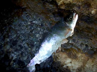 Abends, am Hotel angekommen, zogen allerdings dunkle Wolken auf. Dieser Umstand betraf aber nicht nur das Wetter. Auch ich selber bekam massive Kreislaufprobleme und lies in Folge dessen sogar mein Abendessen stehen. Mir schwante schon Böses für den kommenden Tag! Hier an diesem Felsen zeigte sich eine größere Regenbogenforelle unbeeindruckt von meinen Versuchen, sie zu einem Strike zu bewegen. => |