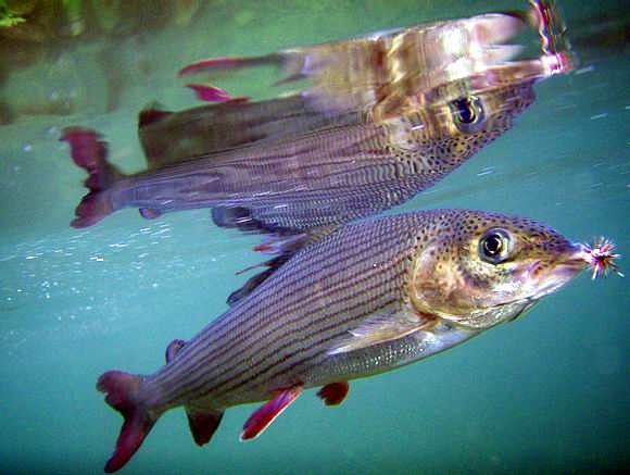 oben: Eine schöne Äsche während des Drills in der kleinen