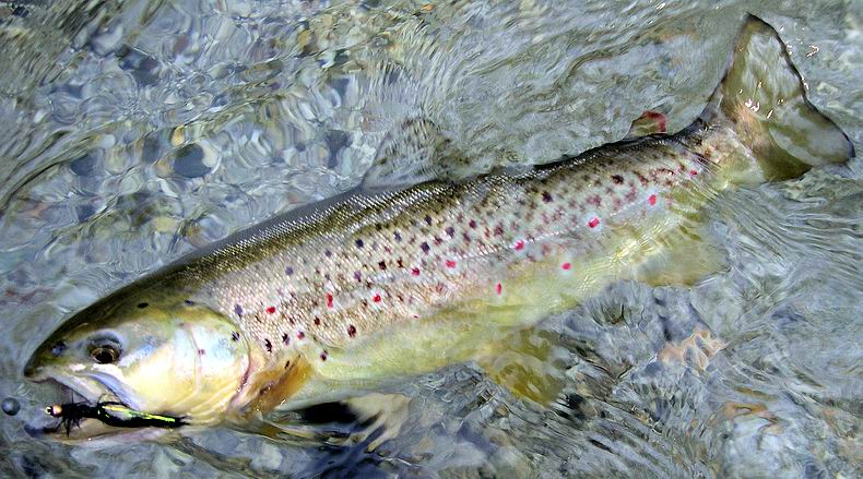 Wir fuhren zur Mitte des Reviers, wo wir in Folge unerwartet eine herrliche Fischerei erlebten. Ich konnte im Laufe des Mittags fünf Äschen zwischen 35 und 40 Zentimetern fangen. Die erste Äsche machte sich über einen schwarzen Wooly-Bugger mit Conehead her, während die vier weiteren allesamt mit einer Adams Irresistible verführt werden konnten. Kurz bevor wir die Heimfahrt zum Hotel antraten, konnte ich zudem noch eine bildhübsche Bachforelle mit besagter Adams fangen. |