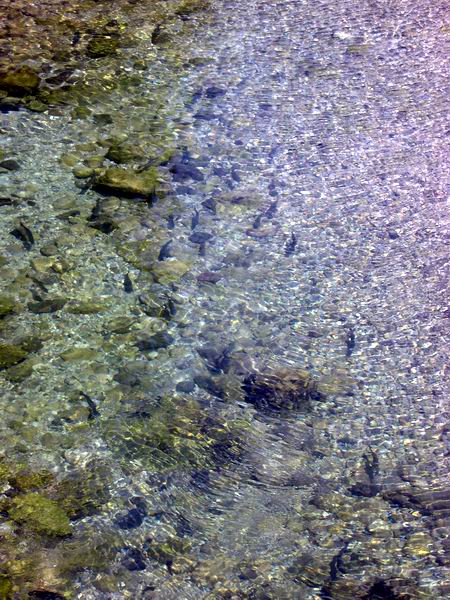Inzwischen hatten Werner und Heinz (wohl aufgrund mangelnden Erfolges) die Stelle unterhalb der Brücke geräumt und so beschloss ich, es dort selber noch einmal zu probieren. Die Fische waren noch da und gut auszumachen. Die Fischerei gestaltete sich aber schwierig, da die Fische heikel waren und sich offensichtlich nicht in bester Beißlaune befanden. Es gelang mir dennoch, eine Handvoll schöner Bach- und Regenbogenforellen mit einer Adams Irresistible bzw. einer Royal Wulff trocken zu überlisten. Na also.... es geht doch! Ich nutzte währenddessen das glasklare Wasser, um ein paar schöne Unterwasseraufnahmen zu schießen. Am späten Mittag stießen Werner und Heinz wieder zu mir und schlugen einen Revierwechsel vor. Wir packten unsere sieben Sachen und fuhren flussaufwärts, um eine andere Angelstelle zu finden. Letztendlich wählten wir eine Brücke bei Bohinjska Bela aus. Auch dort zeigte sich die Sava äußerst vielseitig strukturiert und direkt oberhalb der Brücke befand sich ein Pool mit Fischen in respektablen Größen. Dieser Pool