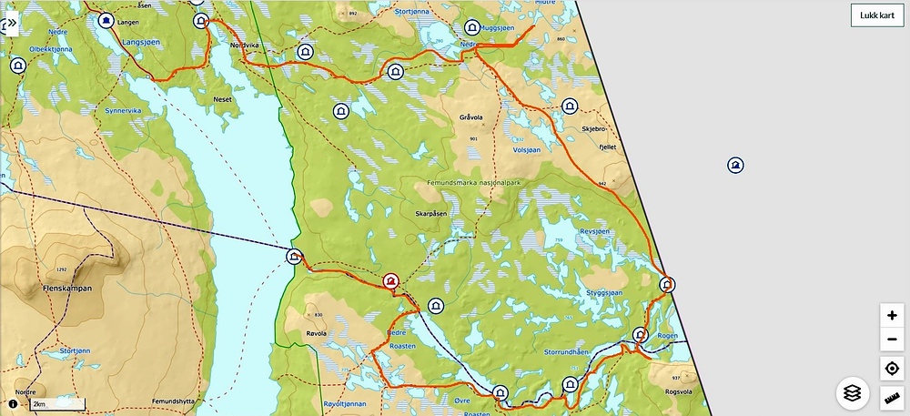 Nach einigem Hin und Her entschied ich mich für den Femundsmarka-Nationalpark. Die Gegend ist bei Norwegern und Schweden recht beliebt, dadurch trifft man eigentlich jeden Tag einige Menschen und es gibt auch ein weites Netz and offiziellen Wegen und Trampelpfaden. Hier meine Route: |