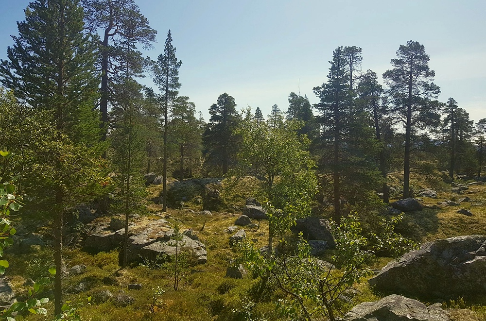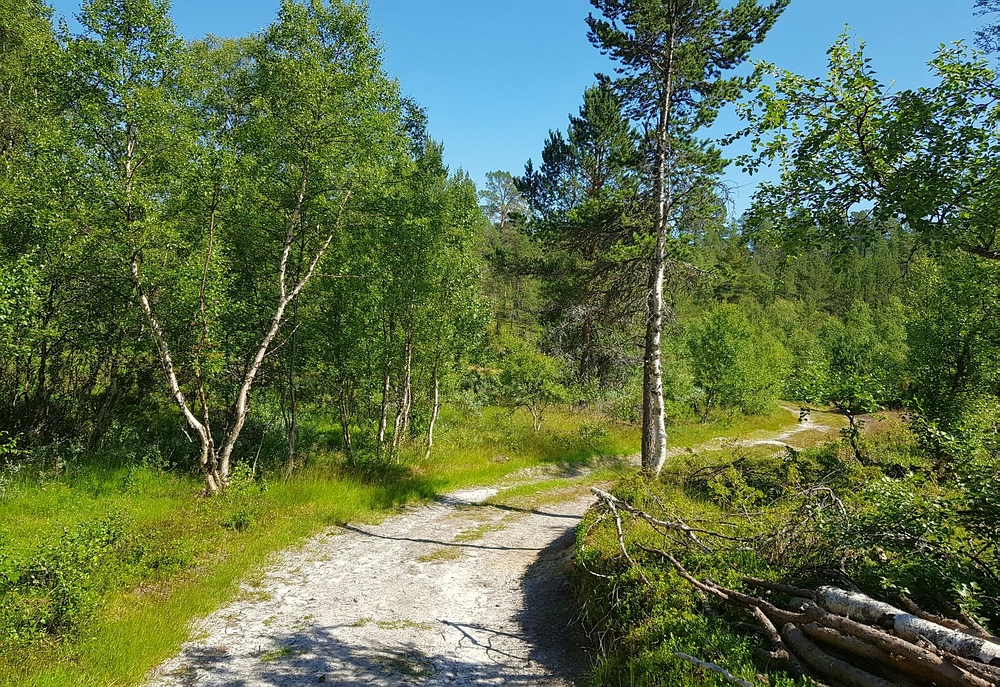 Irgendwann bin ich nur noch 60km von meinem Ziel entfernt und soll trotzdem noch zwei Stunden fahren. Dann lotst mich google auf eine Schotterpiste, die mit jedem Kilometer enger und schmaler wird und ich verstehe. Ich schleiche die immer abenteuerlicher werdende Piste teilweise mit nur 10km/h entlang und halte sogar hin und wieder an, um zu schauen wie ich dicke Steine auf der Straße am besten umfahre. Nach ungefähr einer Stunde auf dieser Höllenpiste lande ich wieder auf einer normalen zweispurigen Schotterpiste und es geht entspannt ans Ziel. Ich parke bei Synnervika, ziehe mich in Ruhe um, trinke noch ein letztes Bier und dann geht es bei 24° im Schatten auf in die Natur. Zunächst noch auf einer breiten Piste, die aber zusehends schmaler wird... |