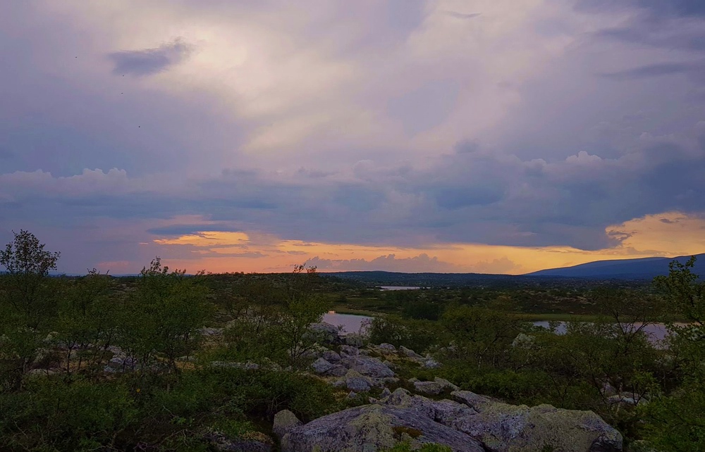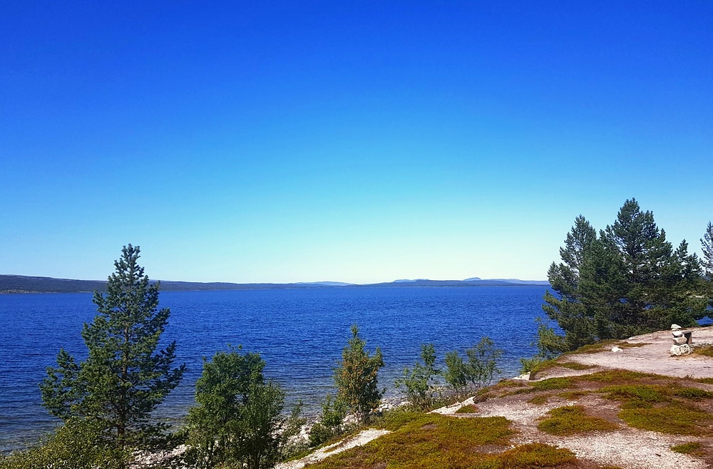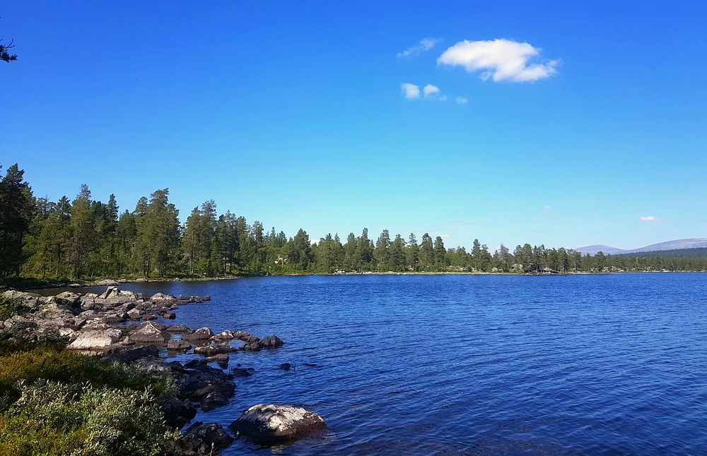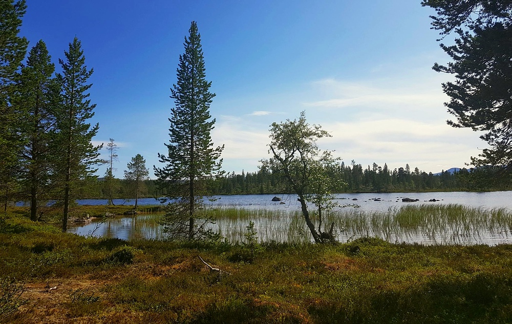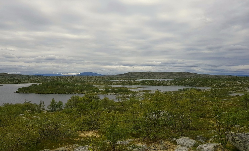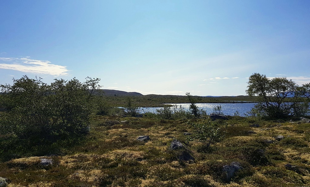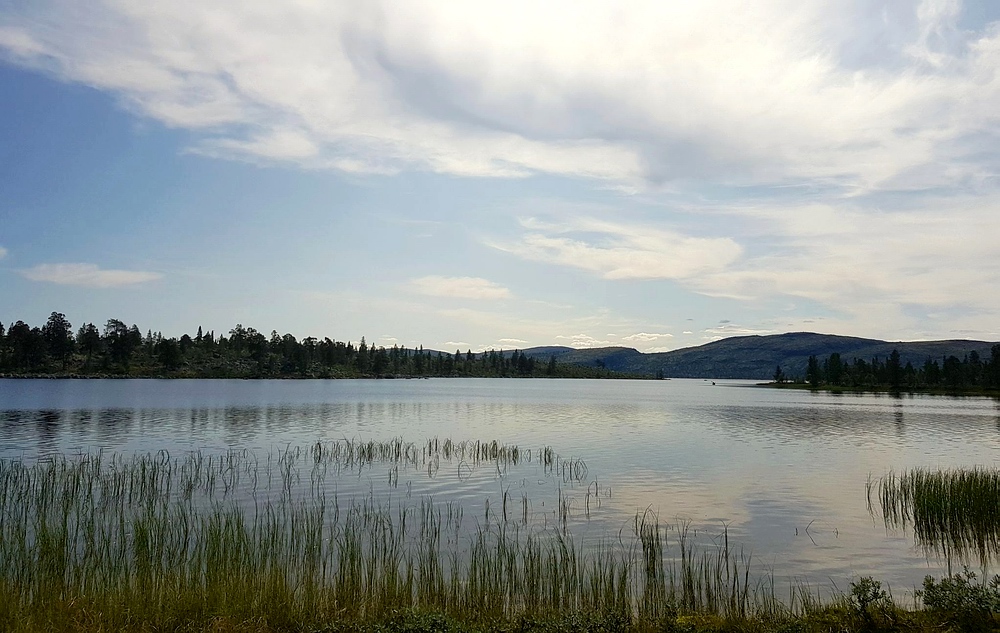 | Nach einigen 100m Querfeldein gelange ich wieder auf den Wanderweg und bin einige Minuten später am See. Am Nedre Mugsjøen soll es schöne Sandstrände geben, hier wollte ich eigentlich kurz Rast machen und baden. Leider ist der Strand schon von der norwegischen Familie belegt, aber wenigstens bekomme ich von ihnen einige gute Tipps, wie ich mein nächstes Tagesziel am besten erreiche und auch den Hinweis, dass für den Abend Gewitter zu erwarten sind. Nachdem ich mich verabschiedet habe, genieße ich noch von einem Hügel aus die Aussicht. |