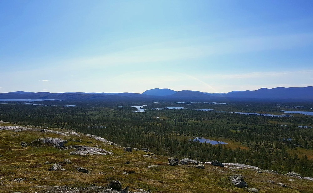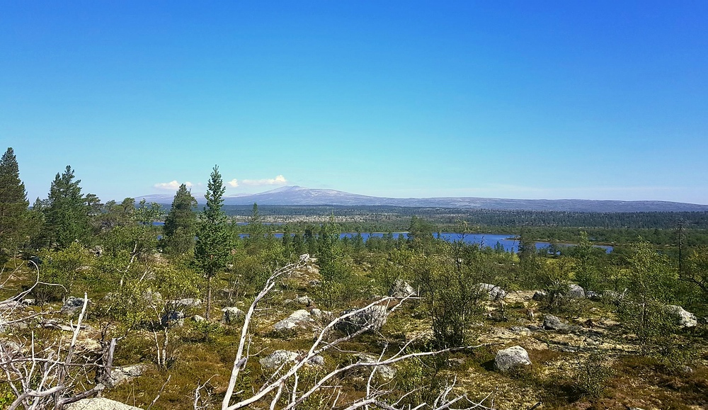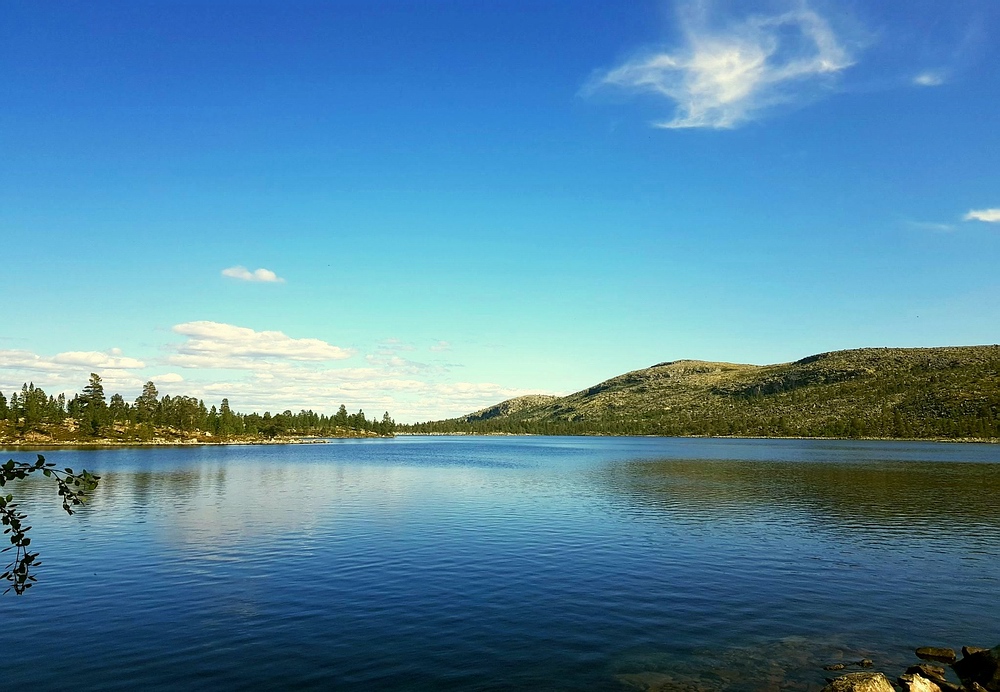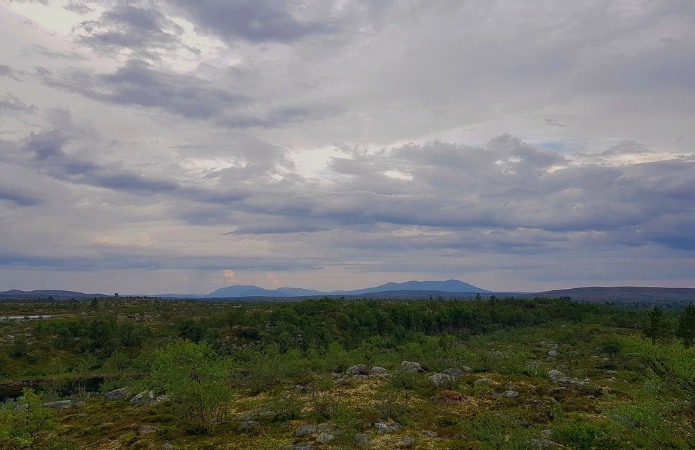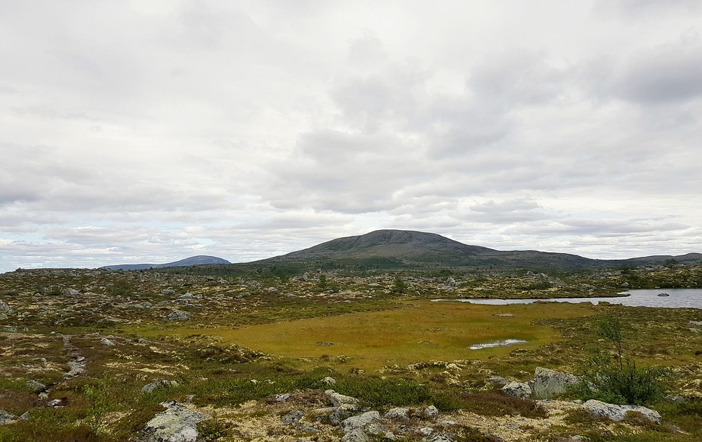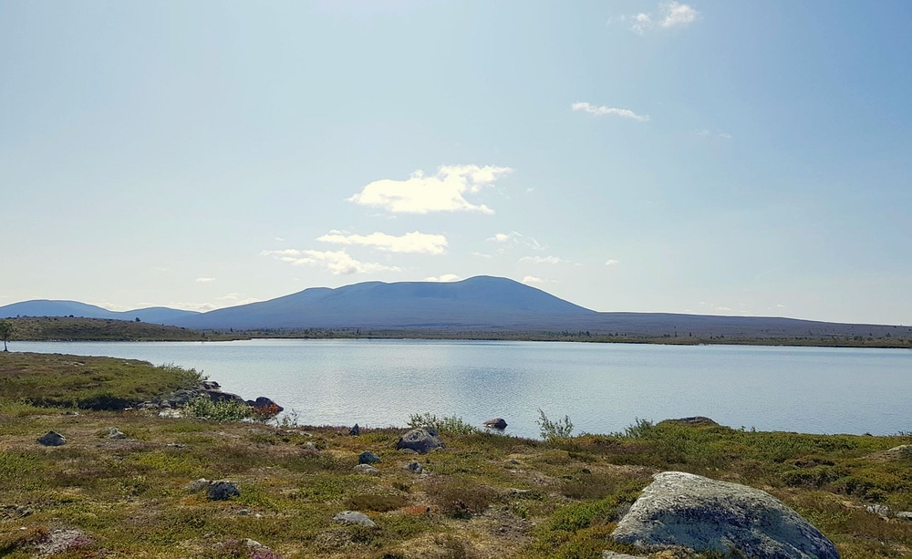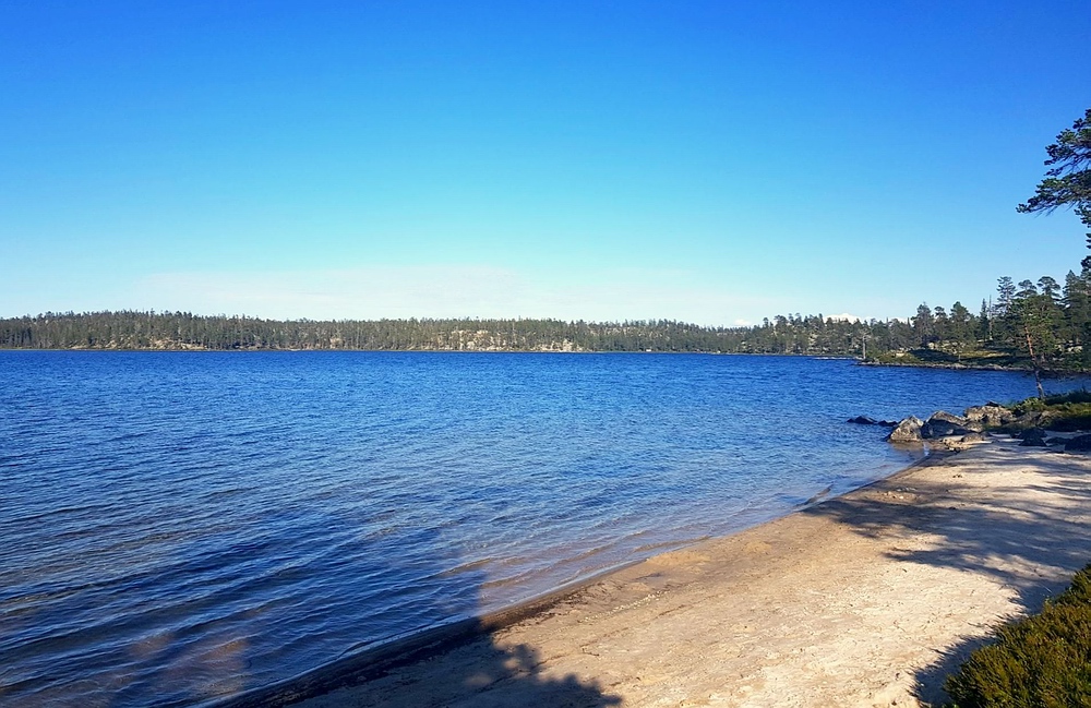 | Nach einigen 100m Querfeldein gelange ich wieder auf den Wanderweg und bin einige Minuten später am See. Am Nedre Mugsjøen soll es schöne Sandstrände geben, hier wollte ich eigentlich kurz Rast machen und baden. Leider ist der Strand schon von der norwegischen Familie belegt, aber wenigstens bekomme ich von ihnen einige gute Tipps, wie ich mein nächstes Tagesziel am besten erreiche und auch den Hinweis, dass für den Abend Gewitter zu erwarten sind. Nachdem ich mich verabschiedet habe, genieße ich noch von einem Hügel aus die Aussicht. |