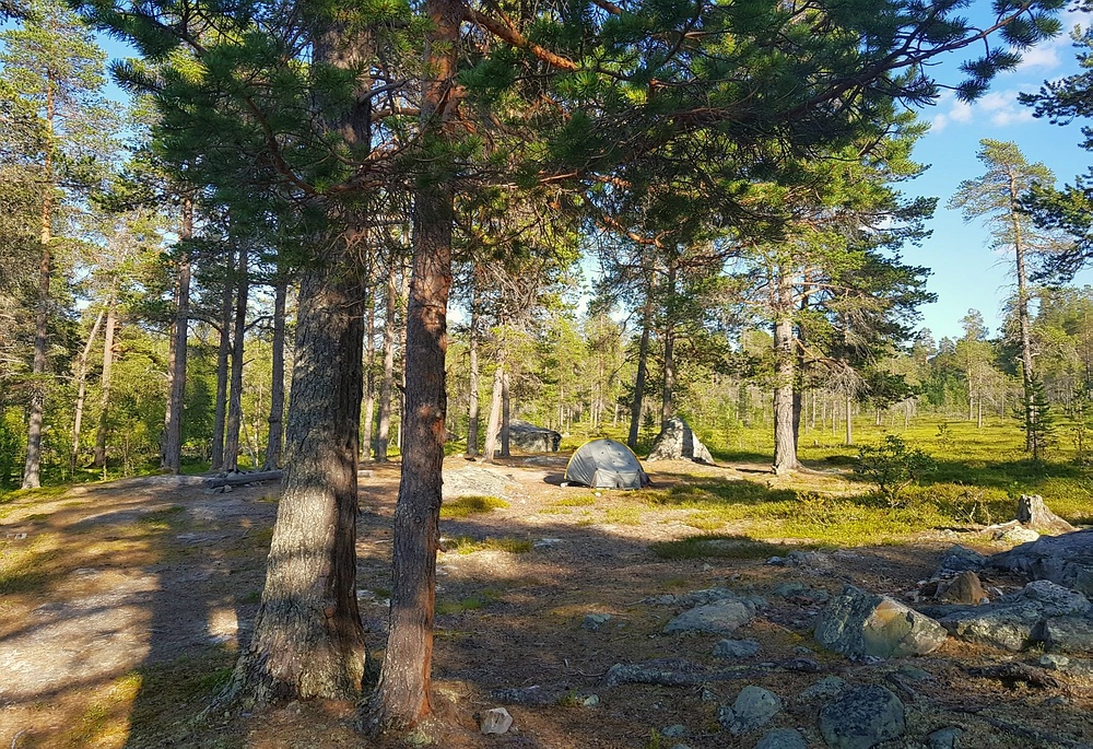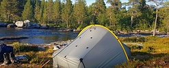| Am Ziel meiner Tagesetappe, einem recht langen fließendem Stück mit einem langgezogenen See in der Mitte, muss ich dann noch recht lange nach einem Platz suchen, um mein Zelt aufzustellen. Nach einigem Suchen finde ich dann aber auf einem kleinen Hügel einen Traumplatz. |