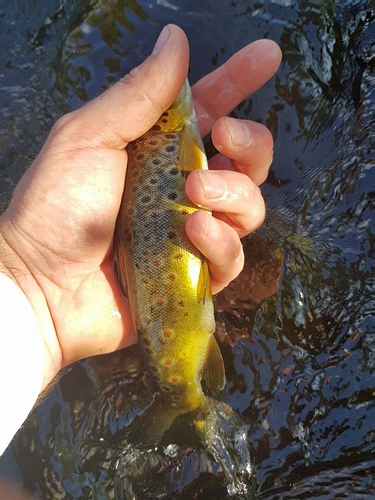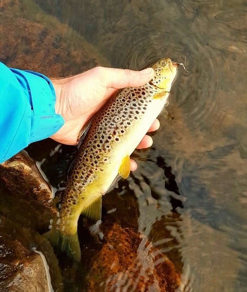 | Direkt unter dem Wasserfall schnappt sich dann auch gleich beim ersten Wurf eine Forelle die Trockenfliege und kommt auch mit, zwei Würfe später verliere ich eine weitere, ähnlich große. Weiter bachabwärts habe ich eine kurzweilige Fischerei mit zahlreiche Forellen, allerdings deutlich kleiner als die ersten beiden Fische. Leider sind keine Äschen mehr dabei. |