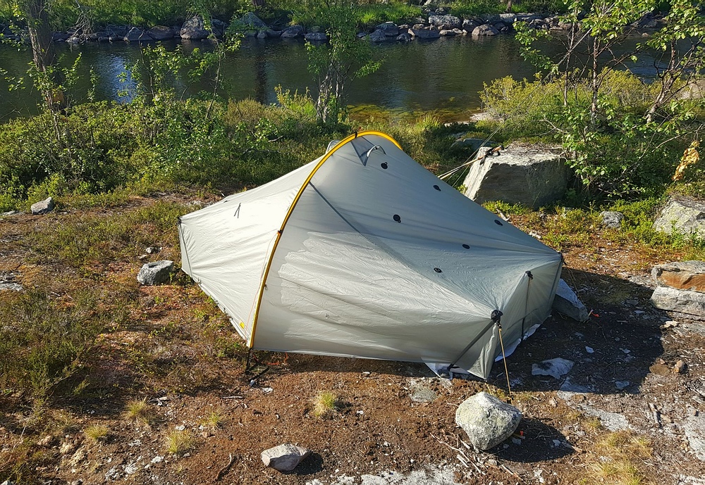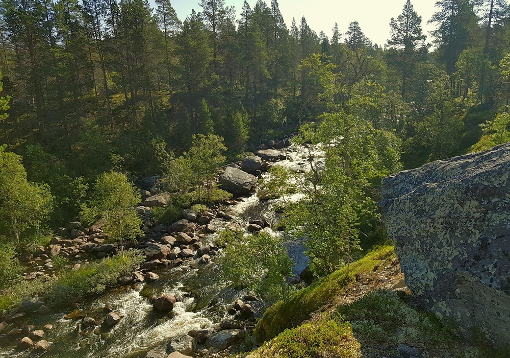 | Mein Ziel ist ein bei google earth gut zu erkennender Wasserfall unterhalb des Nedre Muggsjøan. Dieser liegt ca. 600m abseits des Weges und sollte daher deutlich weniger frequentiert sein als mein vorheriger Schlafplatz. Irgendwann muss ich also den Pfad verlassen und mich noch für 600m durch das Gebüsch schlagen. Bei meinen letzten Touren im Norden war ich ja meistens deutlich weiter nördlich und auch höher unterwegs, da war die Fortbewegung abseits der Wege recht einfach. Diesmal ist es deutlich anstrengender, Hügel, Moore, Büsche und vor allem mit Moos überwucherte Steinfelder machen mir das Leben schwer und ich brauche für die paar Meter fast eine halbe Stunde. Dann verbringe ich nochmal eine Ewigkeit damit, einen geeigneten Zeltplatz zu finden. Irgendwann finde ich eine flache Felsplatte direkt am Fluss und sichere die Heringe einfach mit Steinen, es ist ja zum Glück nicht windig... |