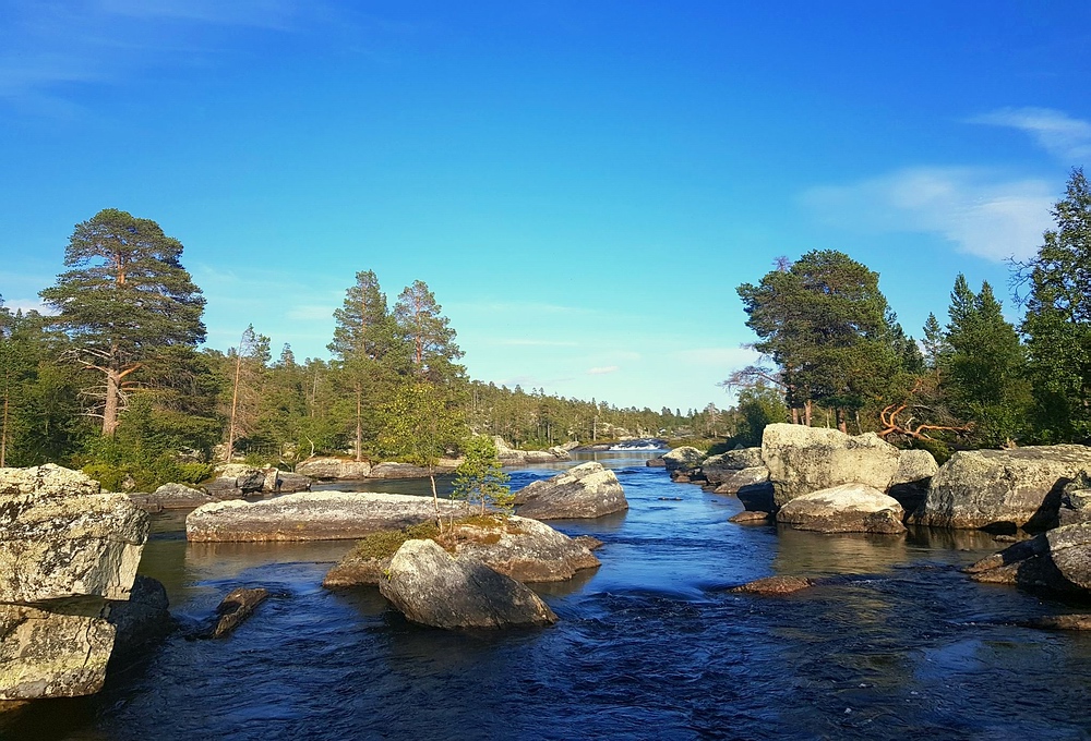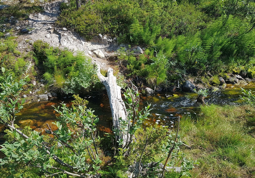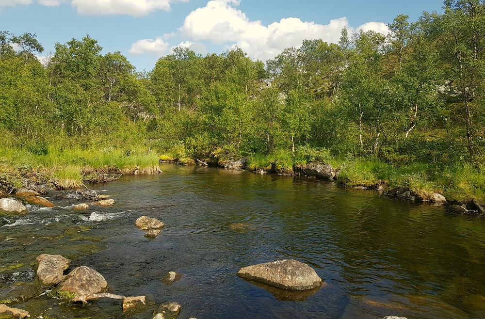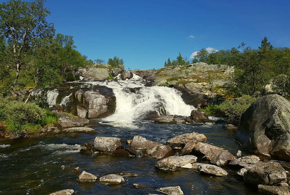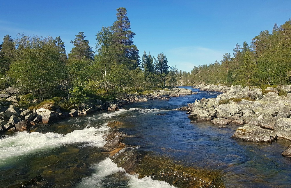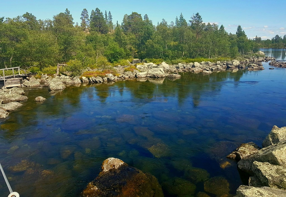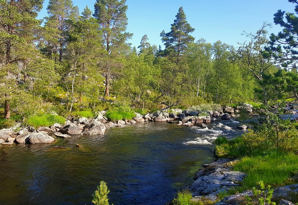 | Die 2km gibt es eigentlich einen Wanderweg, leider verzweigt dieser regelmäßig und die Steinhaufen und Markierungen sind auch nicht immer gut zu sehen, so dass ich regelmäßig querfeldein laufe. Bei einer dieser Aktionen steht plötzlich ein anderer Wanderer vor mir, der ebenfalls auf der Suche nach dem Pfad ist. Nachdem wir uns ca. 10min in etwas holprigen Englisch unterhalten, stelle ich fest, dass er ebenfalls Deutscher ist. Wir laufen gemeinsam bis zur Røa, hier trennen wir uns, er will noch 10-15km weiter, ich habe geplant, am Auslauf des Rogen mein Zelt aufzuschlagen. Am Fluß angekommen, bin ich schwer beeindruckt, das Wasser ist hier bis zu 4m tief, aber kristallklar, am Grund kann ich mehrere Forellen sehen. Die Røa besteht im oberen Bereich aus kurzen schnellfließenden fließenden Passagen, zwischen diversen kleinen und großen Seen. |