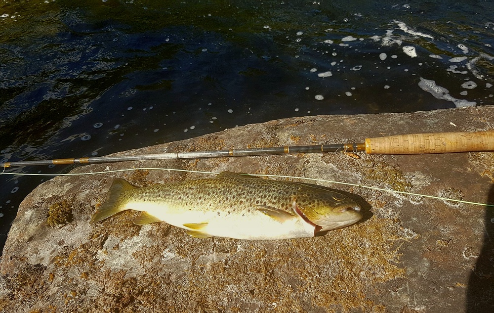 | Auf halber Strecke entscheide ich mich für eine Pause und gehe für eine Weile fischen. Ich probiere es mit der Trockenfliege und kann trotz Mittagshitze mehrere Äschen und einige kleine Forellen landen. | ![]() |