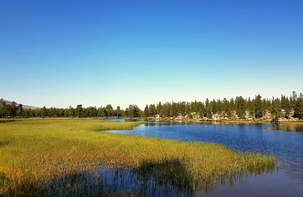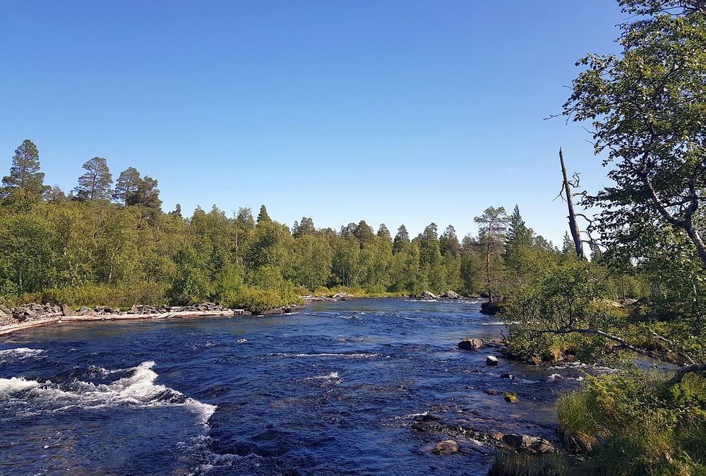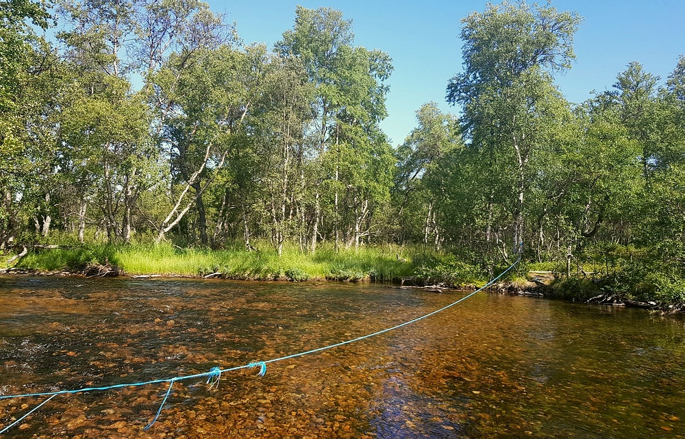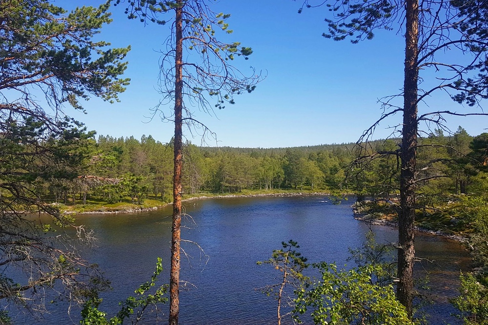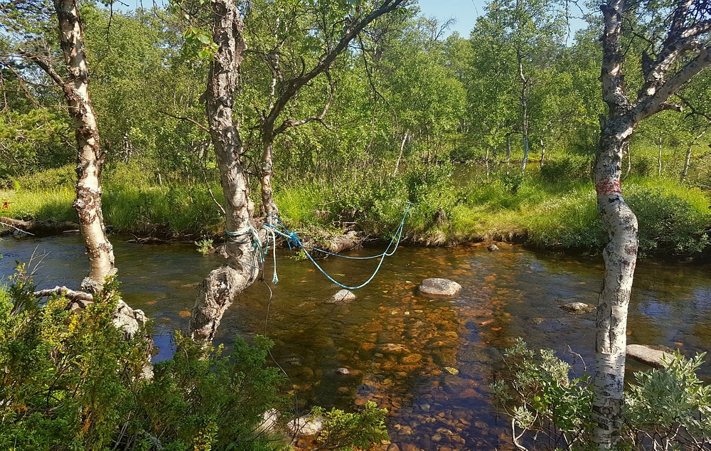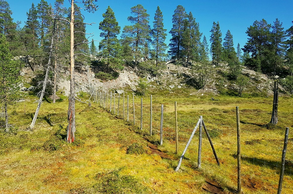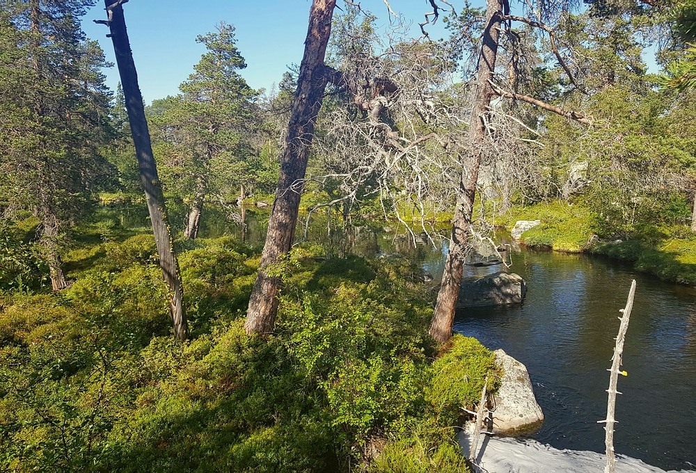 Bis wenige Tage vor der Reise bestand eine Feuerwarnung d.h. es wäre kalte Küche angesagt. Diese wurde zum Glück aufgehoben, so dass zumindest Campingkocher wieder erlaubt waren. Ich hatte einen kleinen Spirituskocher dabei und bin damit sehr sorgsam umgegangen, ein offenes Feuer hätte ich bei der trockenen Hitze als zu gefährlich empfunden. 28.07.2019 Als ich morgens aufwache ist es noch angenehm kühl, ich sitze Barfuß vor dem Zelt, koche mir erst mal einen Kaffee und esse danach in Ruhe mein Müsli. Die Mücken sind noch nicht aktiv, dafür werde ich von Ameisen angegriffen. Nach dem Frühstück ist es so warm, dass ich mich zu einem kurzen Bad entschließe, bevor ich mich auf den Weg mache. Das Tagesziel ist überschaubar, 5km den Fluss aufwärts und unterhalb des Nedre Muggsjøan das Lager aufschlagen. Und so mache ich mich auf den Weg, entlang von zahlreichen riesigen Ameisenhaufen und traumhaften See- und Flussabschnitten. Auf einmal stehe ich vor einem Tor, man bewegt sich hier in einem, bestimmt über 100km² großen, Rentiergatter. |