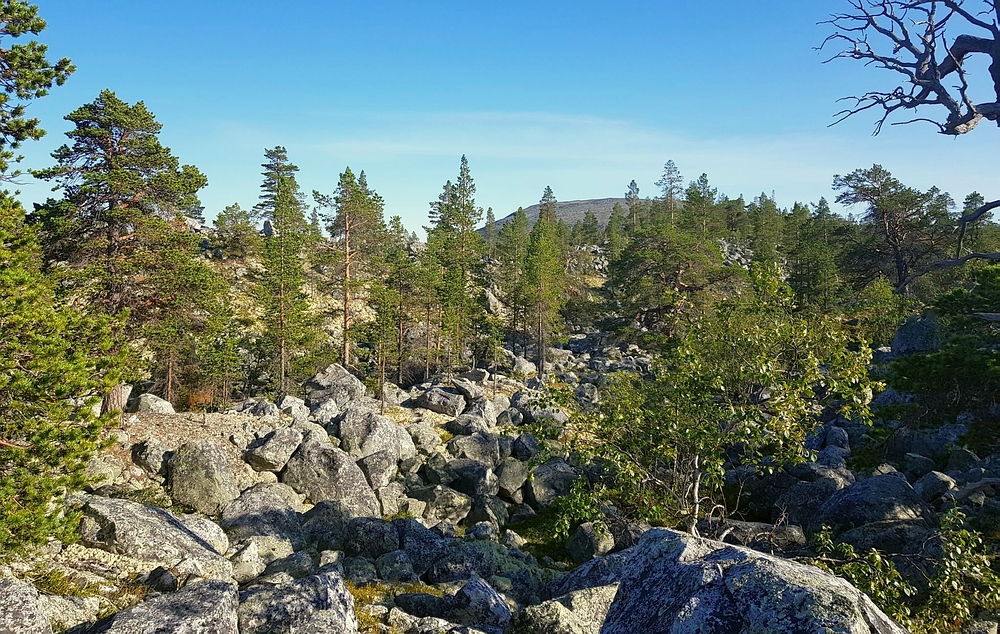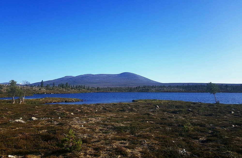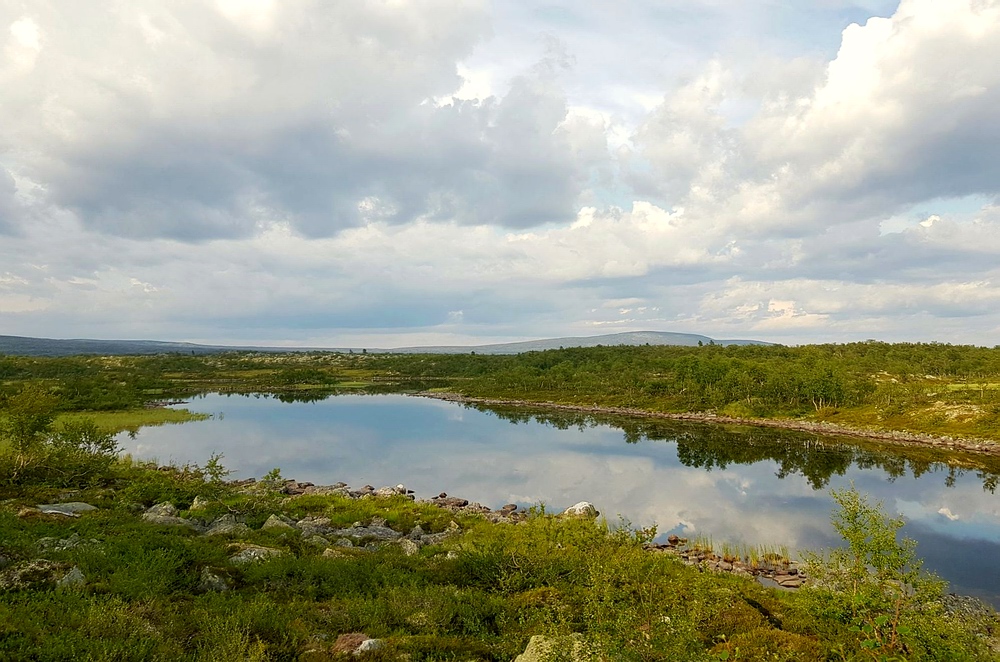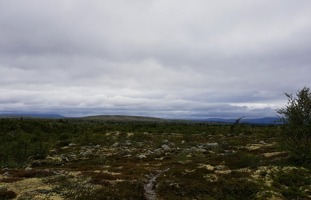 Ich montiere die 5er Rute mit einem langen, dünnen Vorfach und versuche es zuerst mit trocken gefischten Köcherfliegen. Dies funktioniert auch und ich kann einige Fische landen, allerdings muss ich teilweise recht lang auf den Biss warten. Irgendwann wechsele ich auf meinen kleinen Wooly Bugger und beginne nochmal aktiv, die Kante und weitere Strukturen abzusuchen und kann noch einige Forellen erwischen. Die einzige (vermutlich) über 30er verliere ich allerdings. Als die Fischaktivität nachlässt, mache ich mich auf den Weg zurück zum Zelt. Hier finde ich zum ersten Mal auf dieser Tour auch vereinzelt reife Blaubeeren. Nach ungefähr 15min Sammeln habe ich genug für mein Frühstücksmüsli zusammen. Frisch gestärkt mache ich mich auf den Weg, mein ursprünglicher Plan war die Reva, eine Seenkette mit kaum Gefälle, am Südufer zu passieren, allerdings sind hier mehrere Sumpfgebiete in der Karte verzeichnet. Da ich das Gelände jetzt halbwegs einschätzen kann, halte ich es für sehr anstrengend und zeitraubend, diesen Weg zu gehen. Hätte ich gewusst, was mich am Abend erwartet, hätte ich vielleicht trotzdem anders entschieden. Ich habe mich also entschieden, die Reva nördlich zu passieren und um den Weg noch weiter zu erleichtern, möglichst lange oberhalb der Baumgrenze zu bleiben. Dadurch laufe ich zwar einen leichten Umweg und auch noch etwas bergauf, habe aber deutlich besser begehbares Gelände vor mir. |