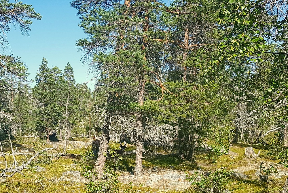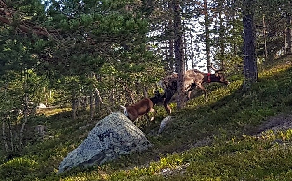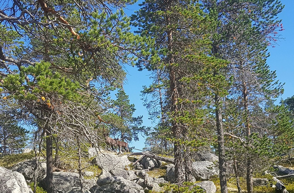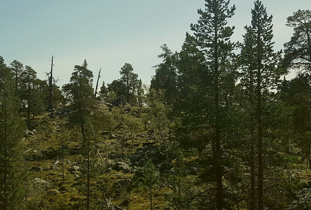 | Dann mache ich mich an den Abstieg und den Abschnitt durch unwegsamen Wald, mit allem was dazugehört, Sumpf, überwachsene Steine, Löcher im Boden, Hitze und jede Menge Mücken und vor allem Bremsen. Dafür begegne ich hier gleich mehreren Rentiertrupps. |