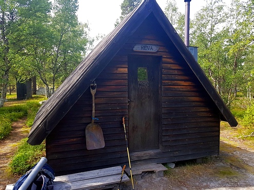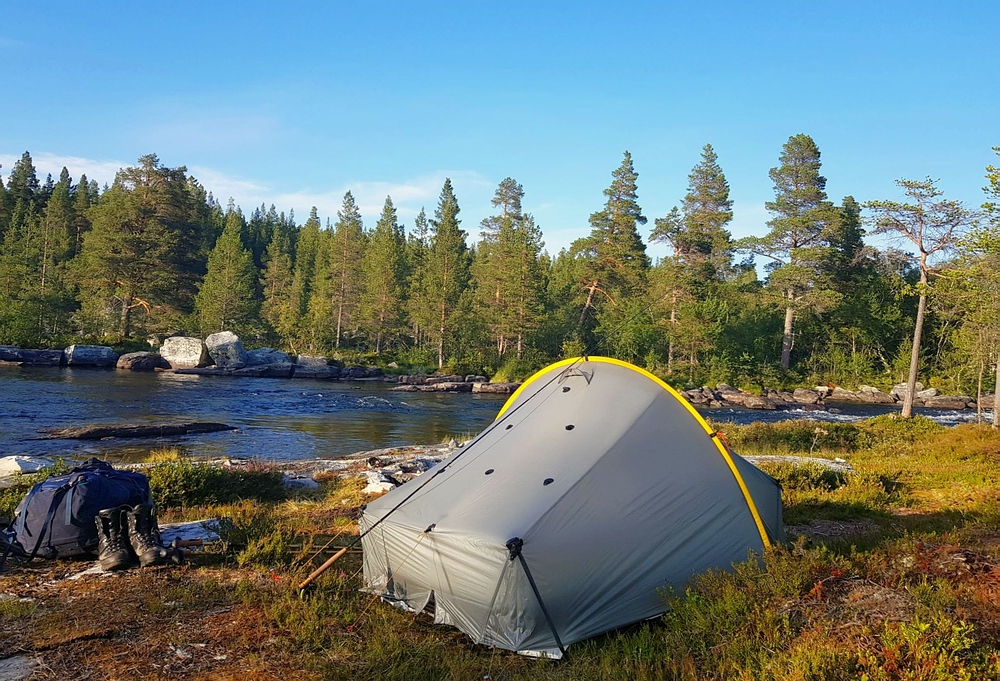 | Dann geht es nochmal ein paar Höhenmeter hoch bis fast ins Fjell. Es wird ziemlich windig und recht kühl, ich brauche eine Weile, einen geeigneten Platz zu finden, baue nur noch mein Zelt auf, diesmal sogar mit Verwendung aller Abspannleinen. Im Windschatten des Zeltes koche ich mir noch mein Abendessen und lege mich schlafen. |