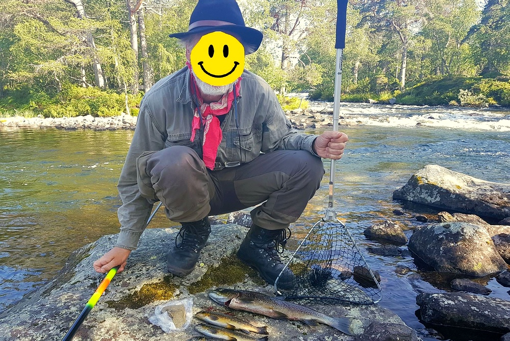 | Jetzt geht es wieder ans Angeln, auch hier kann ich im kristallklaren Wasser einige große Fische entdecken aber auch diese sind extrem scheu. Als beste Methode stellt sich ein flussaufwärts geworfener und schnell eingestrippter Streamer heraus. Leider produziert dieser viele Fehlbisse. Es kristallisiert sich heraus, dass die Ausläufe der Seen absolute Hotspots sind. Komischerweise sitzen die Norweger alle an den Einläufen. Auch hier begegne ich flussabwärts einen alten Norweger mit seinem Sohn und die beiden waren sehr erfolgreich, die kleinen Forellen haben ~30cm… |