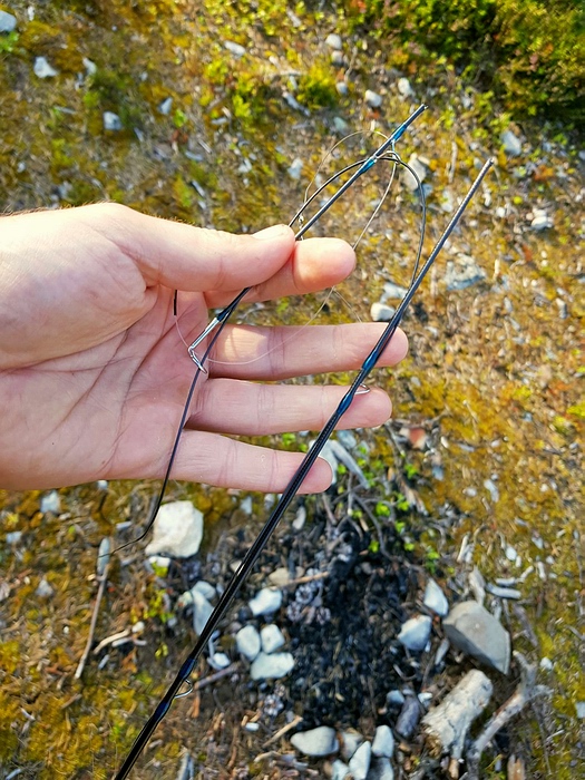 Ich entscheide mich, flussabwärts noch einen Versuch mit der #7 und einem handlangen Tandem Streamer zu machen. Zielfisch sollten eigentlich große Forellen sein. Der Fluss mündet hier in einen kleinen Teich ich mache einen weiten Wurf in den Mündungsbereich, dabei verheddert sich leider die Schnur. Während ich noch am Enttüddeln bin, ruckt es plötzlich an der Rute und es fühlt sich nach einem ordentlichen Fisch an. Nach kurzem Drill stelle ich fest, dass die vermeintliche Forelle recht stachelig ist... |