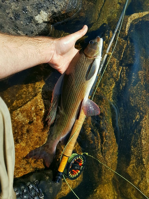 Ich setze den Rucksack ab und schaue mich noch etwas um und kann tatsächlich noch mehrere weitere Äschen entdecken. Die Große ist zwar vorerst nicht zu sehen aber 3 Stück von ~40cm stehen nur wenige Meter vom Ufer entfernt. Ich montiere eine kleine Eintagsfliegen- Nymphe mit oranger Tungstenperle, die man sehr gut auf Sicht präsentieren kann. Die Nymphe landet 2-3m oberhalb des Äschentrupps und treibt perfekt auf sie zu. Hinter einem Stein kommt allerdings eine etwas Kleinere hervor und schnappt sich die Fliege. Die anderen lassen sich von Drill und Landung aber nicht stören und so kann ich noch zwei weitere aus dem Trupp rauspicken. Die Fische nehmen die Nymphe absolut arglos, als wenn hier noch nie jemand gefischt hätte. Wahrscheinlich liegt der Spot zu dicht am Anleger und alle laufen vorbei. Auf einmal taucht auch die große Äsche wieder auf und stellt sich auf ihrem alten Standplatz ein. Beim ersten Wurf driftet die Nymphe zu hoch, beim 2. Versuch aber kommt sie perfekt auf den Fisch zu, die Äsche schert aus und nimmt! Der Drill erinnert mich an die Forelle vom Vortag, nur das die Äsche zwischen den Fluchten einfach bockig am Boden bleibt. Nach einigem hin und her kann ich den Fisch landen. |