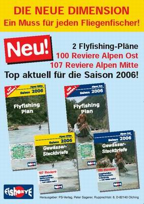 Wir freuen uns ganz besonders, dass wir das erste Fliegenfischen-Magazin sein dürfen, das Ihnen die zeitgleich in den Handel kommenden, brandneuen "Fly Fishing Plänen" nebst "Gewässer-Steckbriefen" vorstellen kann. Doch damit nicht genug: wer pfiffig war und sich an unserem kleinen Preisausschreiben beteiligte, hatte die reelle Chance, eine von zwanzig dieser Set's zu gewinnen! DIE NEUE DIMENSION für Fliegenfischer !!! Nach langen und aufwendigen Recherchen hat es der PS-Verlag Olching geschafft, top-aktuell für die Saison 2006 100 Fliegenfischer-Reviere Alpen-Ost und 107 Fliegenfischer- Reviere Alpen-Mitte, zusammenzustellen und herauszugeben. Der Flyfishing-Straßenplan im Maßstab 1:320.000: Eine WELTNEUHEIT - ist diese Kartographie der neuesten Satellitentechnik. Die Geländedarstellung wurde nach einem aus Satellitenbildern generierten, digitalen Geländemodell erstellt. Es zeigt als Novum das wahre Bild der Erdoberfläche. Die neuartige, praktische und übersichtliche Faltung der Karte ist patentrechtlich geschützt. Das Papier ist zellophaniert, wasserabweisend und abwischbar. Mit Markierung der Tageskarten-Ausgabestellen ! Das Gewässer-Steckbriefheft: In Verbindung mit dem 64-seitigen Gewässer-Steckbriefheft haben Sie ab jetzt die Möglichkeit, sich detailliert einen Überblick über 207 Reviere zu verschaffen, Tageslizenzen zu bestellen und - falls gewünscht - sofort eine Übernachtungsmöglichkeit zu finden! Ausführliche Gewässer-Steckbriefe aller angebotenen Fliegenfischer-Reviere, mit Preis, Telefonnummern, Adressen, Unterkunft-Information. Kein lästiges Recherchieren nach neuen Gewässern mehr, alle wichtigen Daten auf einen Blick! Preis pro Plan u. dazugehörigem Steckbriefheft € 14,95 | Auslieferung an den Fachhandel ab 20. Februar 2006. Künftig gibt es immer Anfang Februar von jedem dieser Pläne eine neue, erweiterte und total aktualisierte Auflage für die neue Saison! Verleger: Peter Sagerer, PS-Verlag, Rupprechtstraße 8, D-82140 Olching, Tel. 0049-8142-20445, Mail: info@ps-verlag.com (vorstehender Kontakt nur für Händleranfragen oder allgemeine Auskünfte!). Der Verkauf an Endverbraucher erfolgt ausschließlich über den Fachhandel: derzeit schon bei Flyfishing Europe in Möhnesee und Garching b. München, bei Fisherman´s Partner in München, Gersthofen b. Augsburg und Salzburg, bei Milan Wutte in Vesielach (Südkärnten) und bei Bernhard in der Schweiz erhältlich. Weitere Händler folgen wöchentlich. Zur Einführung gab es ein kleines Quiz und 20 Set's zu gewinnen... (hier Klicken) |