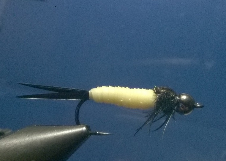 Da mag ich mich auch mal wieder aktiv beteiligen. Ich bin nicht der große Binder, der auf Details achtet. Das tut der Fisch meist aus Zeitmangel auch nicht. Ab April darf ich in wunderschönen Gebirgsböchen rund um Garmisch fischen und man flüsterte mir zu, dass dort Steinfliegenlarven gut gehen sollen. Also ab an den Stock und diese Kreatur hier geschaffen. Erstes Bild noch "nackt", also ohne Frabe. Farbgebung mittels Edding und die dann mittels Ohrstäbchen verwischt. Beine aus kleinen Biots. Rückenpanzer aus Pfauengras.