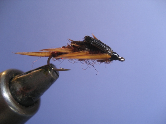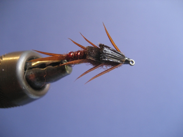 Hier noch ein kleinerer Bruder wegen der Hakenlängenbegrenzung und bei den Beinen einfacher gebunden. Nach dem Festlegen des Latex einfach etwas Rebhuhnrupf abgezupft und dann vorne eingebunden.