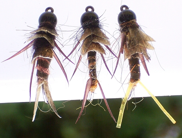 An meinen Gewässern gibt's keine (?) großen Steinfliegenlarven, aber ich wollte mal ein paar Tage an ein solches Gewässer und hab mir ein paar verschiedene Muster gepfriemelt ( leider war dann Hochwasser und es ging recht wenig)