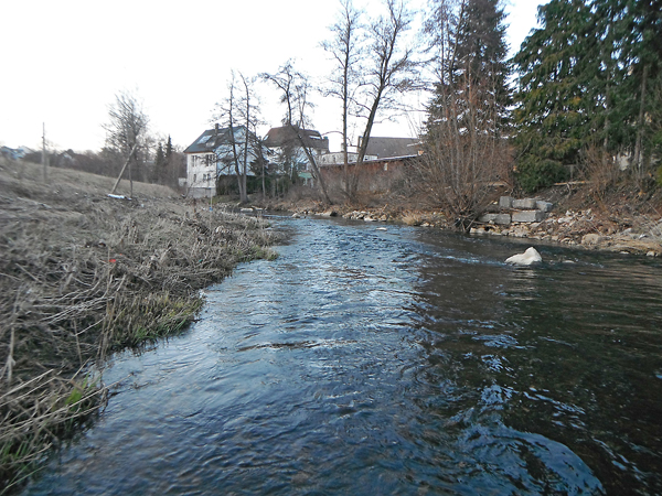 07:10 Uhr: Die 5# er Rute ist fertig montiert und ich stehe mit einem schwarzen Woolly Bugger bereit für die ersten Würfe der Saison. Der Fluss ( obere Alb in Karlsruhe, AVK Gewässer) ist auf normalen Pegel und sehr klar. Die Außentemperatur liegt noch bei -2°. Von Insekten oder Fischen ist nichts zu sehen.