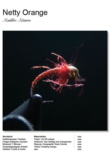 Moin, so wie ich das jetzt verstehe, wird dies Band I Fliegen für Forelle und Äsche. Und in dem Fliegenbuch wirds keine Fotos von den Zielfischen geben -- gute Idee; aber bei dem Rohr könnte man genau die beiden Zielfische als Deco-objekte (Aquarell oder ähnlich -- Kunst, nicht Porno ) einbinden. Dann braucht man noch den Titel des Buches; und dann die Fliegen -- da würde mir so eine Einheit Fliege/Name/Binder vorschweben. Aber vielleicht habt ihr ja noch freie Resourcen und bessere Vorschläge.