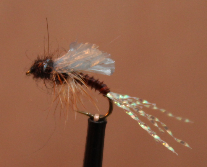 Haken: TMC 100 # 12, Body: Dubbing, Body Stretch, seitlich je eine Straußenfiber, Beinchen: Rebhuhn, Flügelscheide: Bast lackiert, Augen: Nylon